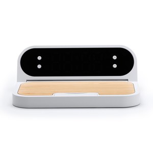 Este carregador combina a beleza natural do bambu com a resistência do ABS reciclado, oferecendo uma solução ecológica.Para além da sua função de carregamento sem fios de 10 W, este carregador também tem uma função de relógio.
