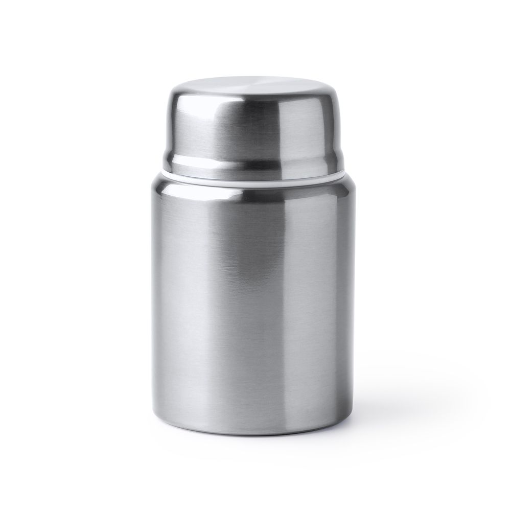 Tampa dupla com colher dobrável de aço inoxidável incluída.