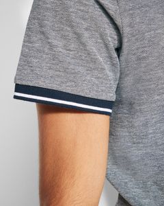 Gola e extremidade das mangas com cor sólida em canelado 1x1 e detalhe decorativo em contraste.