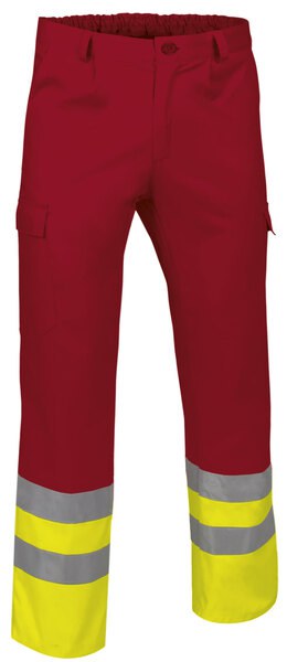 Calças de multibolsos de alta visibilidade. Confeccionado em tecido de sarja de algodão com poliéster para durabilidade e resistência, com duas fitas retro-refletoras cosidas nos punhos das pernas para aumentar a visibilidade dos usuários. Vestuário certificado como EPI de categoria II de alta visibilidade de acordo com as normas 13688 e 20471, classe 1. Fecho com botões e fecho de correr, cintura com laços de cinto, dardos dianteiros e elástico traseiro para maior conforto e melhor ajuste, costuras duplas principais e pontos de maior tracção reforçados com laços de segurança para maior durabilidade e resistência. Dois bolsos oblíquos nas ancas, um bolso traseiro direito e dois bolsos laterais com fecho de aba e velcro, para manter tudo acessível e disponível. Métodos adequados de marcação: serigrafia, bordados, transfer, vinil. Ideal como roupa de trabalho e fardamentos.